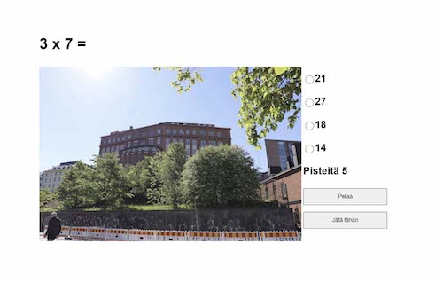Kaiken kertojasiPelissä tehdään kertotauluharjoituksia. Siinä on sata kysymystä kertotauluista. Kaikkiin kysymyksiin on neljä vastausvaihtoehtoa. Pelin nimi on Kaiken kertojasi. |